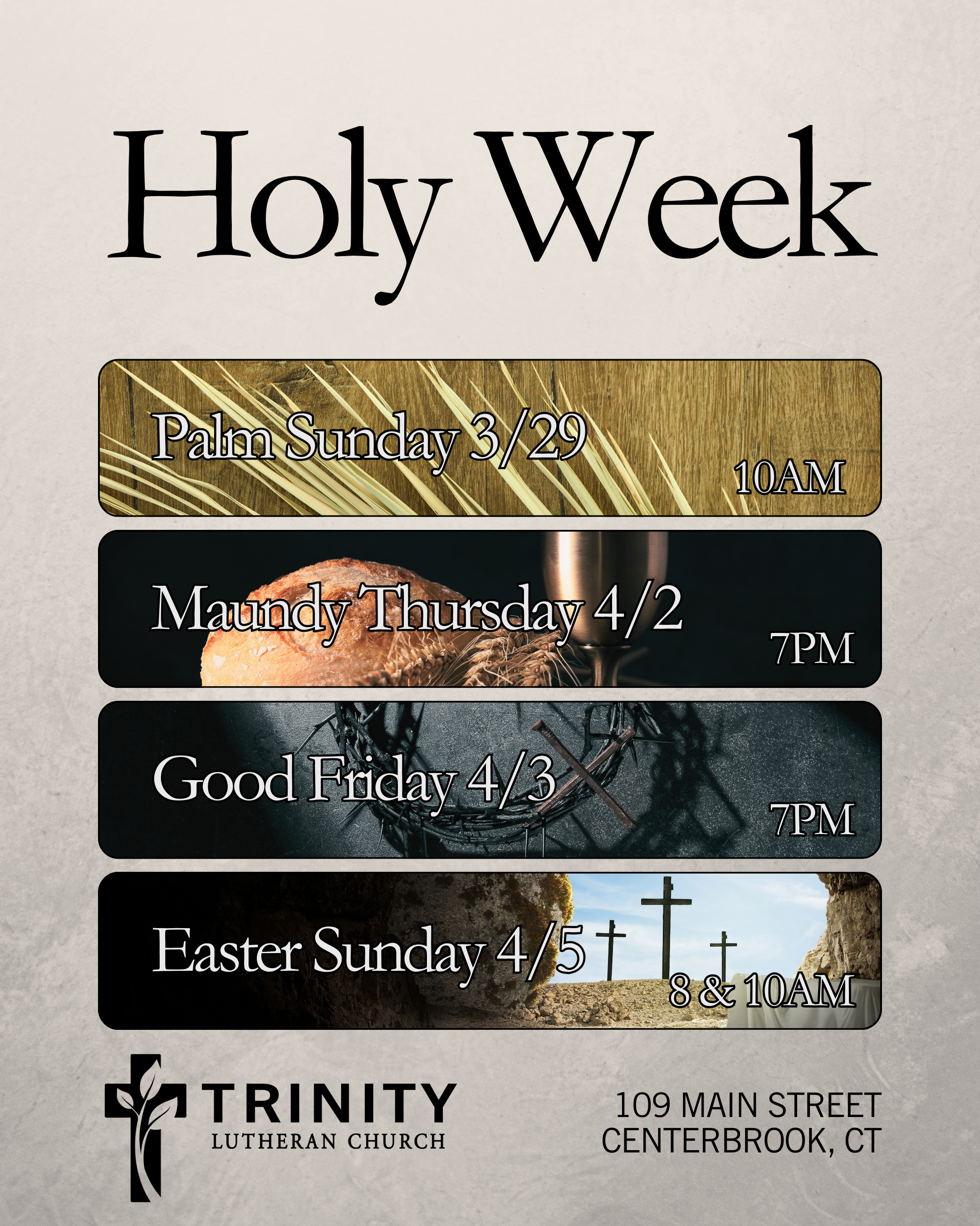 Sunday, March 22nd - Intergenerational Stewardship of the Word event at 9am Sunday, March 29th - Palm Sunday: breakfast at 8:30 and worship at 10am Thursday, April 2nd - Maundy Thursday worship at 7pm Friday, April 3rd - Good Friday worship at 7pm Sunday, April 5th - Easter Sunday worship at 8 & 10am Sunday, April 12th - Breakfast & Bible Study at 9am Sunday, April 26th - Fondue & Games following 10am worship service Sunday, May 3rd - one service at 9am with the spring cleanup of the church following the service Sunday, May 24th - Pentecost & beginning of summer worship with one service at 9am